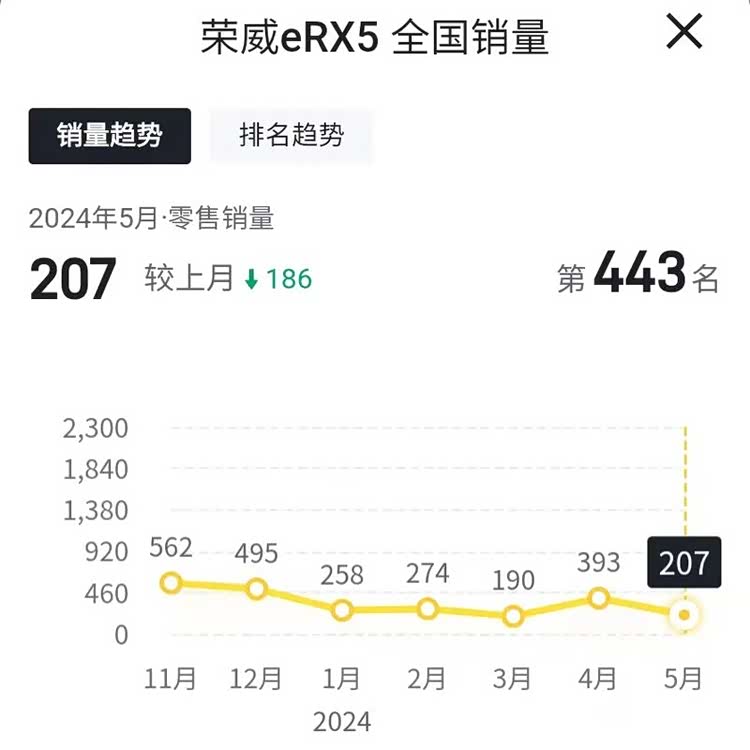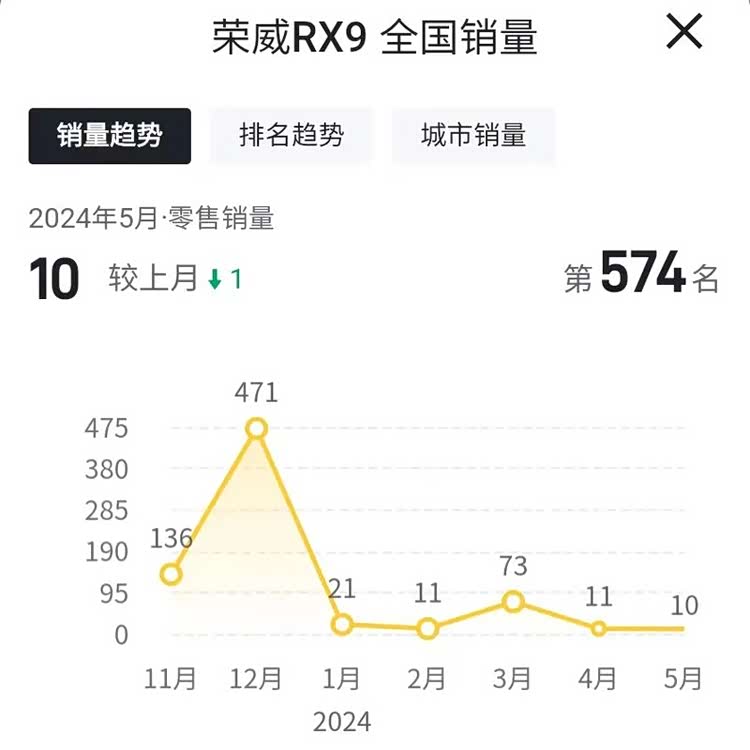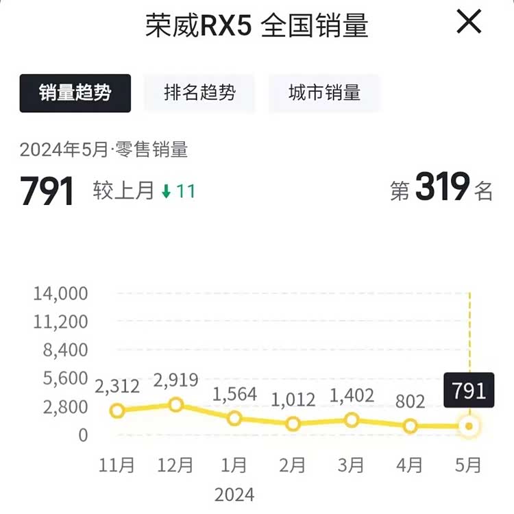 荣威RX5的销量已经下滑至千辆以下,数据显示,2024年5月份荣威RX5的销量为791辆,相比今年4月份的销量802辆,环比下滑1.3%,并且荣威已经连续2个月的月销量未能突破千辆。