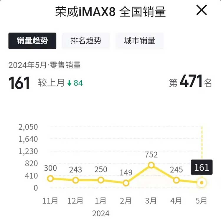 荣威iMAX8在5月份的销量为161辆,相比今年4月份的销量245辆,环比下滑34.28%。