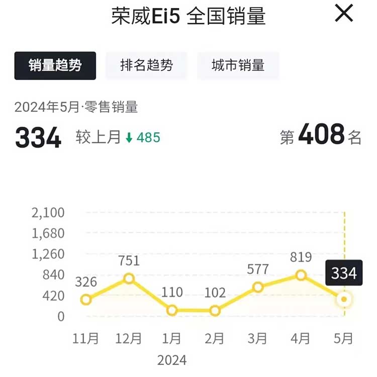 荣威Ei5在5月份的销量为334辆,相比今年4月份的销量819辆,环比下滑59.2%。