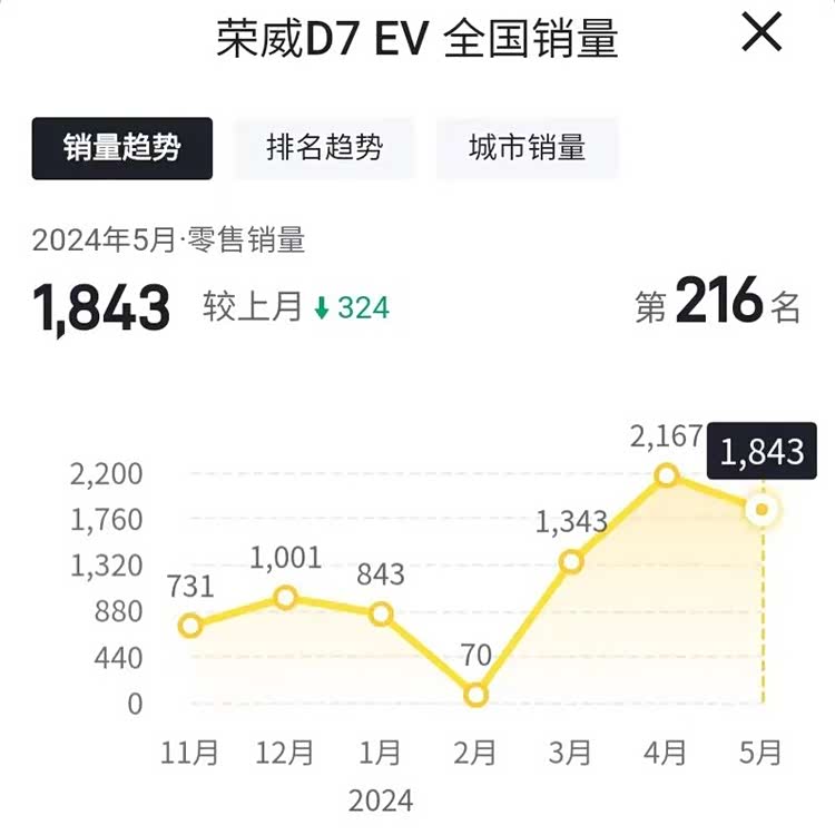 荣威D7 EV也出现了下滑趋势,数据显示,2024年5月荣威D7 EV的销量为1843辆,相比今年4月份的销量2167辆,环比下滑14.9%。