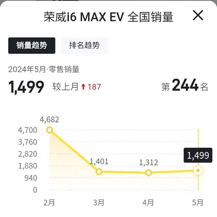 荣威i6 MAX EV的销量虽然相比4月份有所提升,但5月份,荣威i6 MAX EV的销量也只有1499辆。