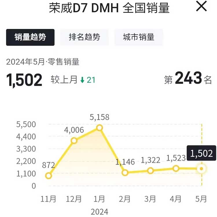 除了荣威D7 EV出现下滑以外,荣威D7 DMH也出现了下滑,数据显示,2024年5月,荣威D7 DMH的销量为1502辆,相比今年4月的销量1523辆,环比下滑1.3%。