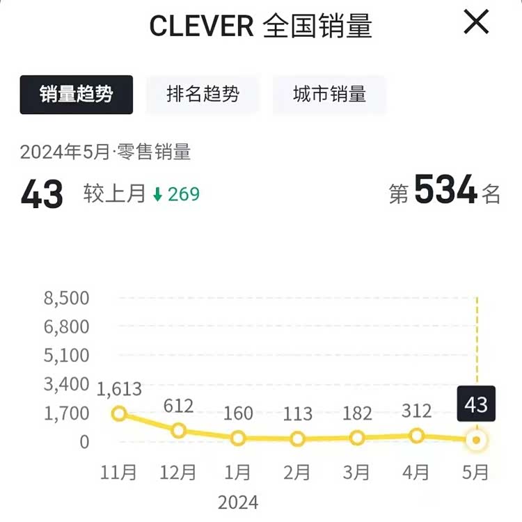 荣威CLEVER在5月份的销量为43辆,相比今年4月份的销量312辆,环比下滑86.21%。