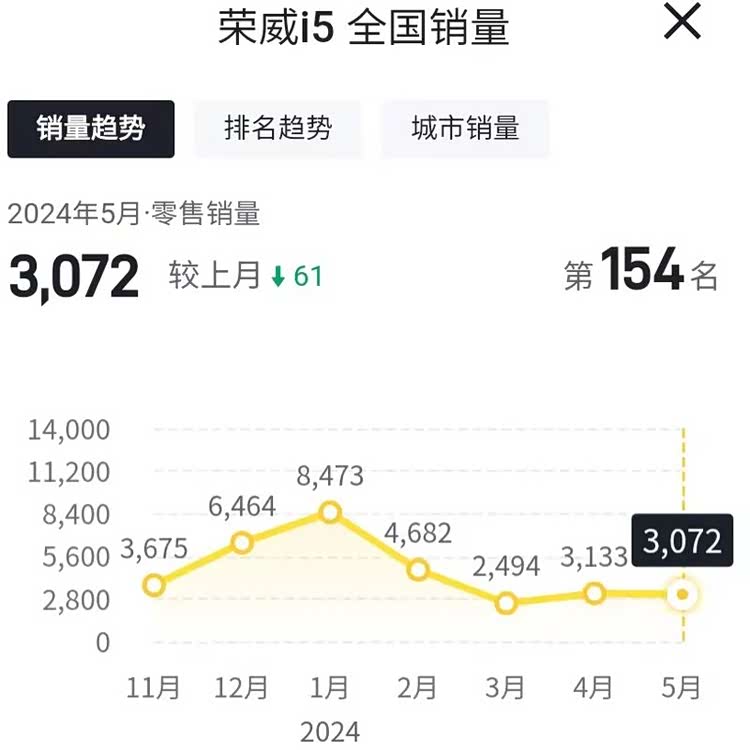 根据第三方数据显示,2024年5月份,荣威品牌的销量为9574辆,相比今年4月份的销量11079辆,环比下滑13.58%。同时荣威品牌在今年3月份的销量为10097辆,今年2月份的销量为12270辆,今年1月份的销量为16901辆。也就是说今年1-5月份,荣威品牌只有5月份的销量,未能达到万辆以上。