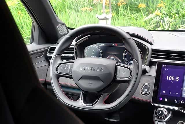领克05的方向盘样式与其它车型也完全不同,手感上表现很不错,握在手里足够粗壮,两边的多功能按键分别可以控制自适应巡航、多媒体控制和行车电脑设定。在使用中还发现,右边的控制键还支持触控功能,这个功能隐藏的还挺深,有点不用不知道啊!