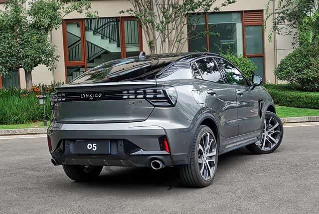 领克05的车身侧面亮点要更多,尤其是B柱之后的掀背车尾样式,一副标准的轿跑SUV身材。车尾部分采用了贯穿式的装饰条,配合能量块样式的尾灯显得足够特别,每次锁车之后,尾灯还会点亮并渐变熄灭,很特别。