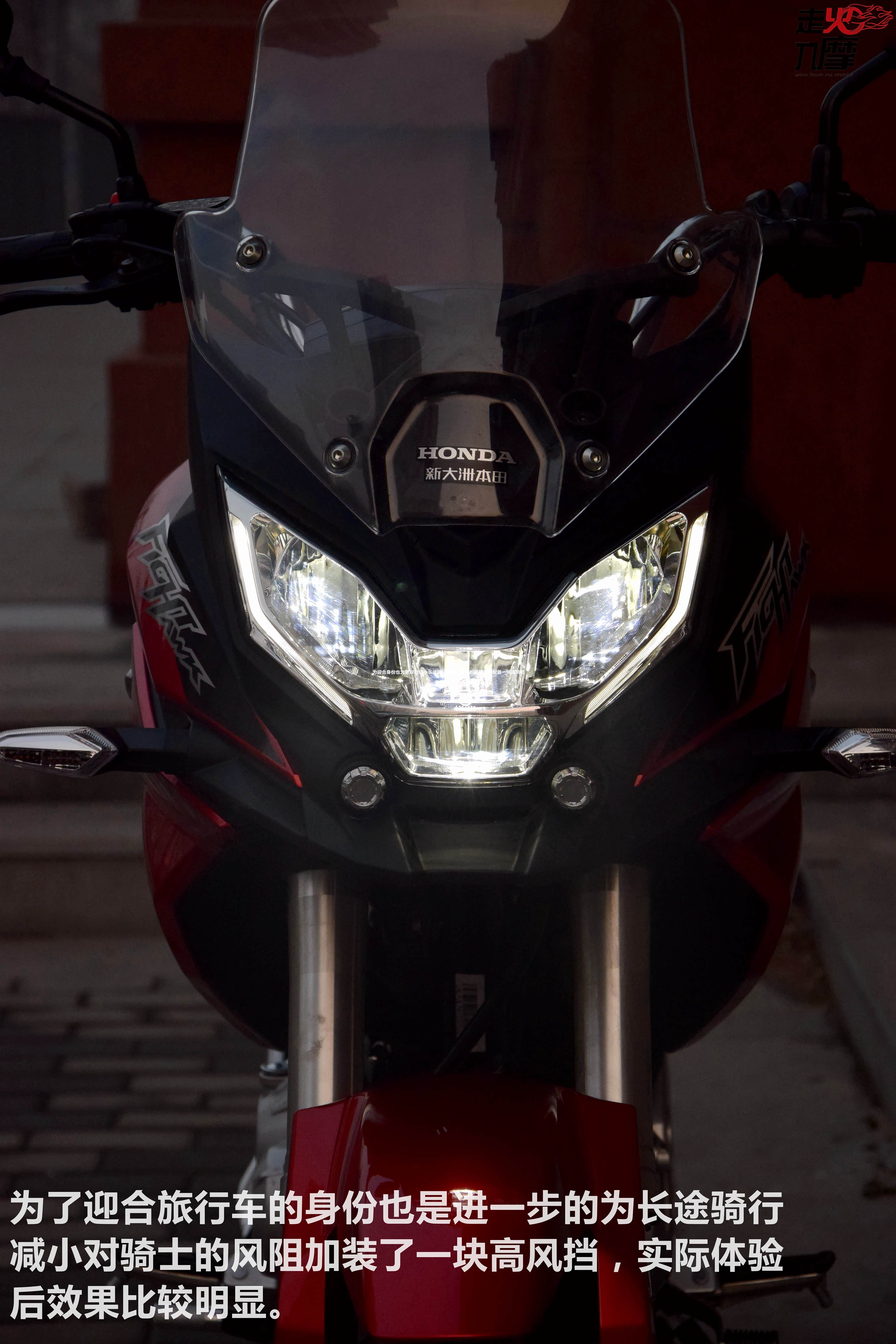 前车灯的设计造型和CBF190R非常相近,190X的车灯在宽度上比CBF190R宽一点,更能撑起饱满的车头。为了迎合旅行车的身份也是进一步的为长途骑行减小对骑士的风阻加装了一块风挡,实际体验后效果比较明显。