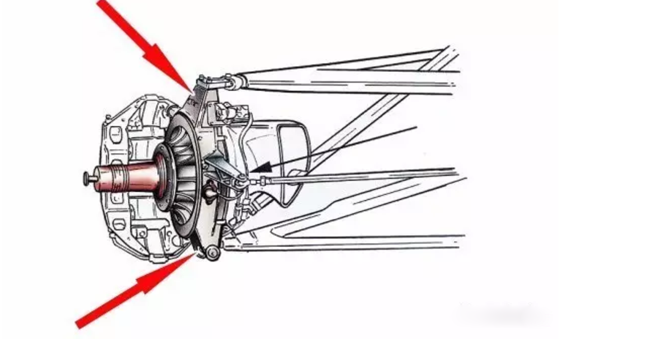 梅赛德斯的前悬挂还有一个不同点,他们的上叉臂与前轮转向节(羊角)的连接点。传统连接方式如下图,但是梅赛德斯今年将上连接点外伸出来与上叉臂链接。下图红色箭头是转向节与上下叉臂的连接点,黑色箭头所指是转向节臂与转向横拉杆连接点。
