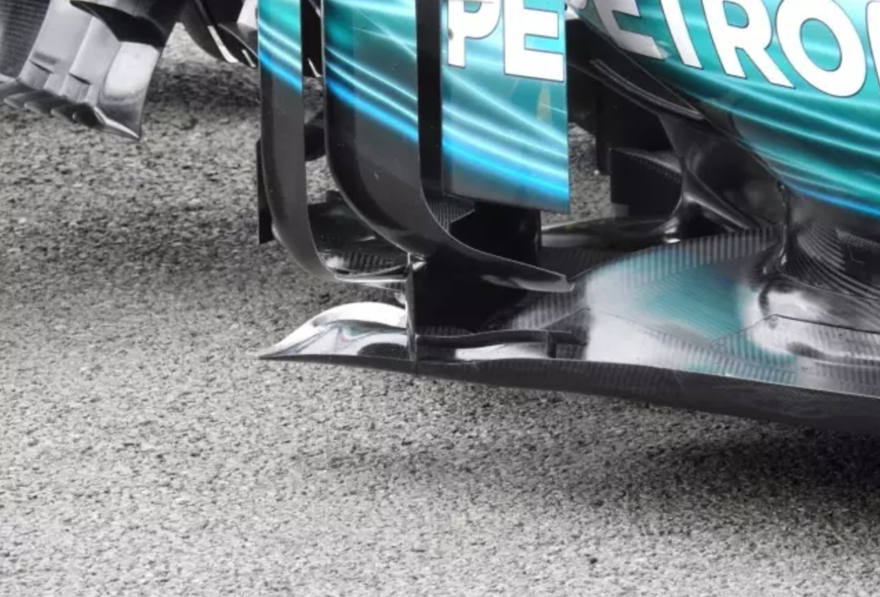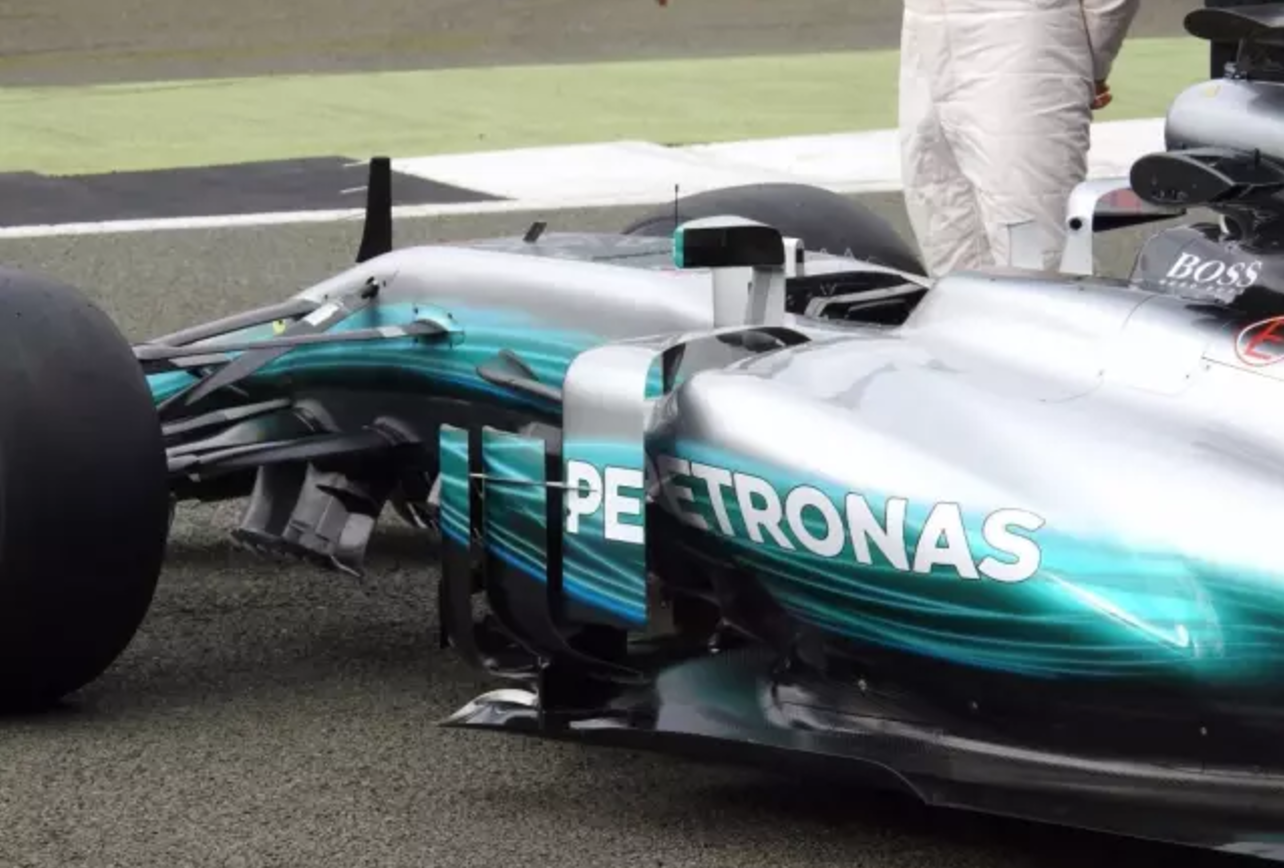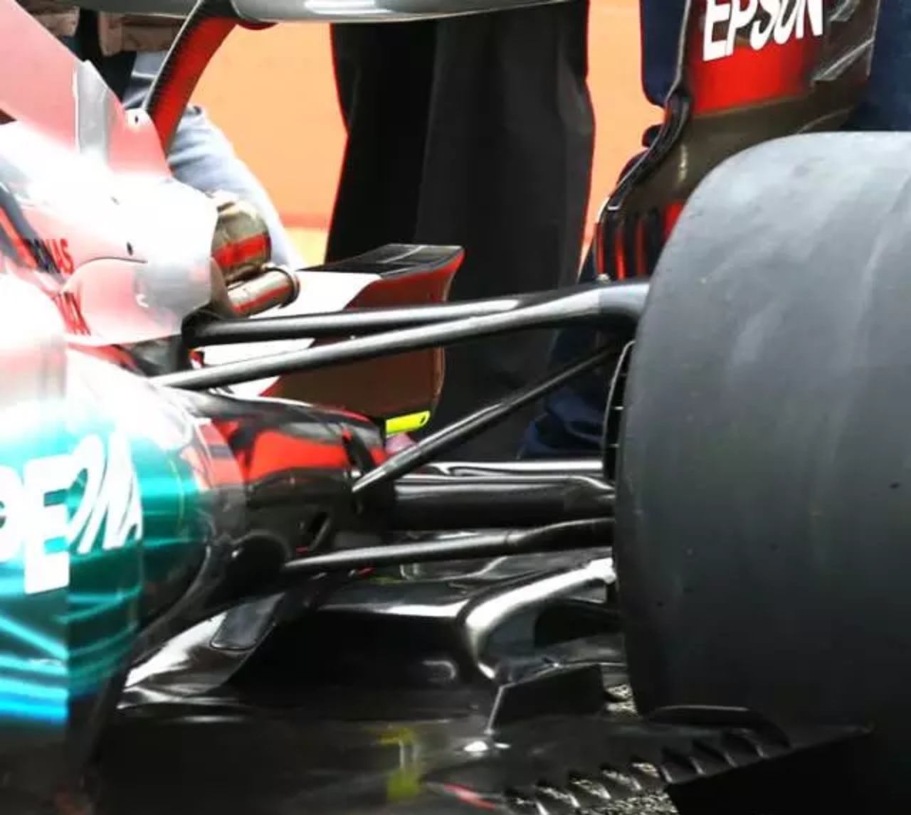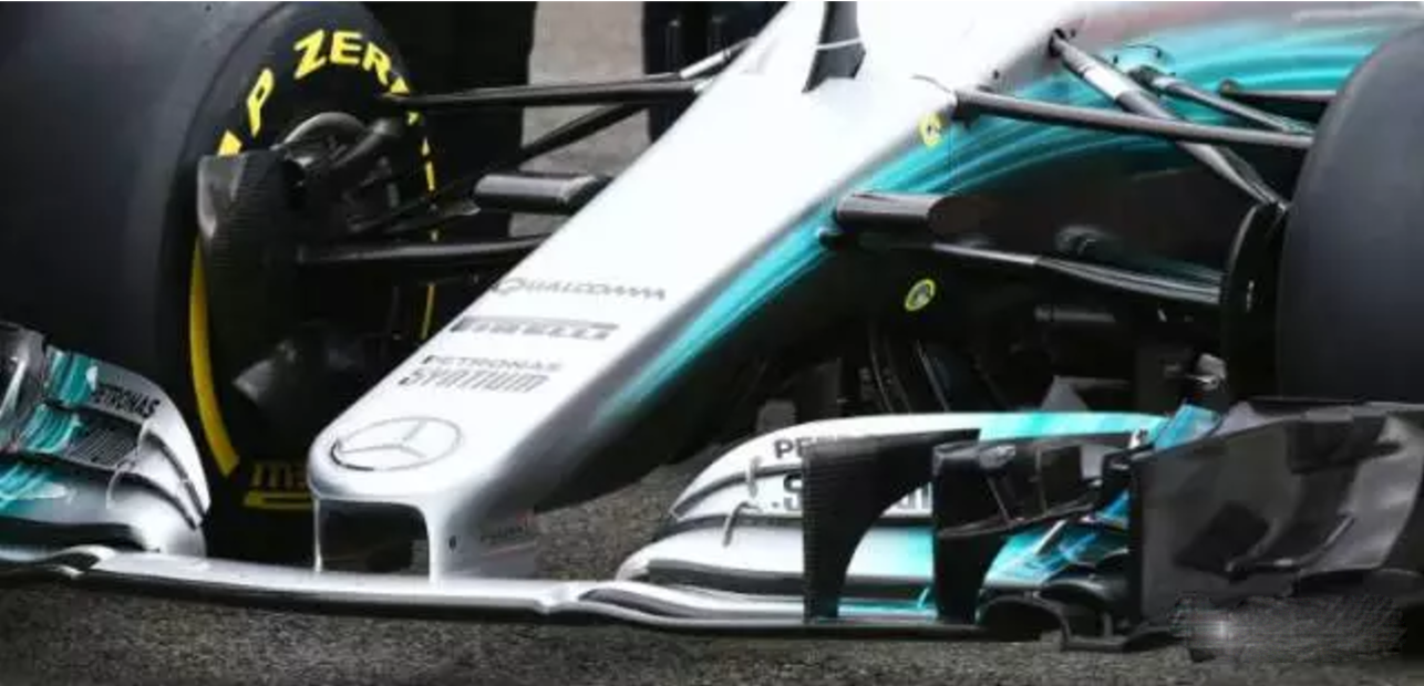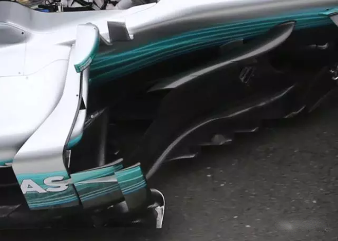 梅赛德斯今年的侧箱垂直端板设计也相当复杂,从外到内一共三层叠加设计,这是自从09年以来从未有过的。