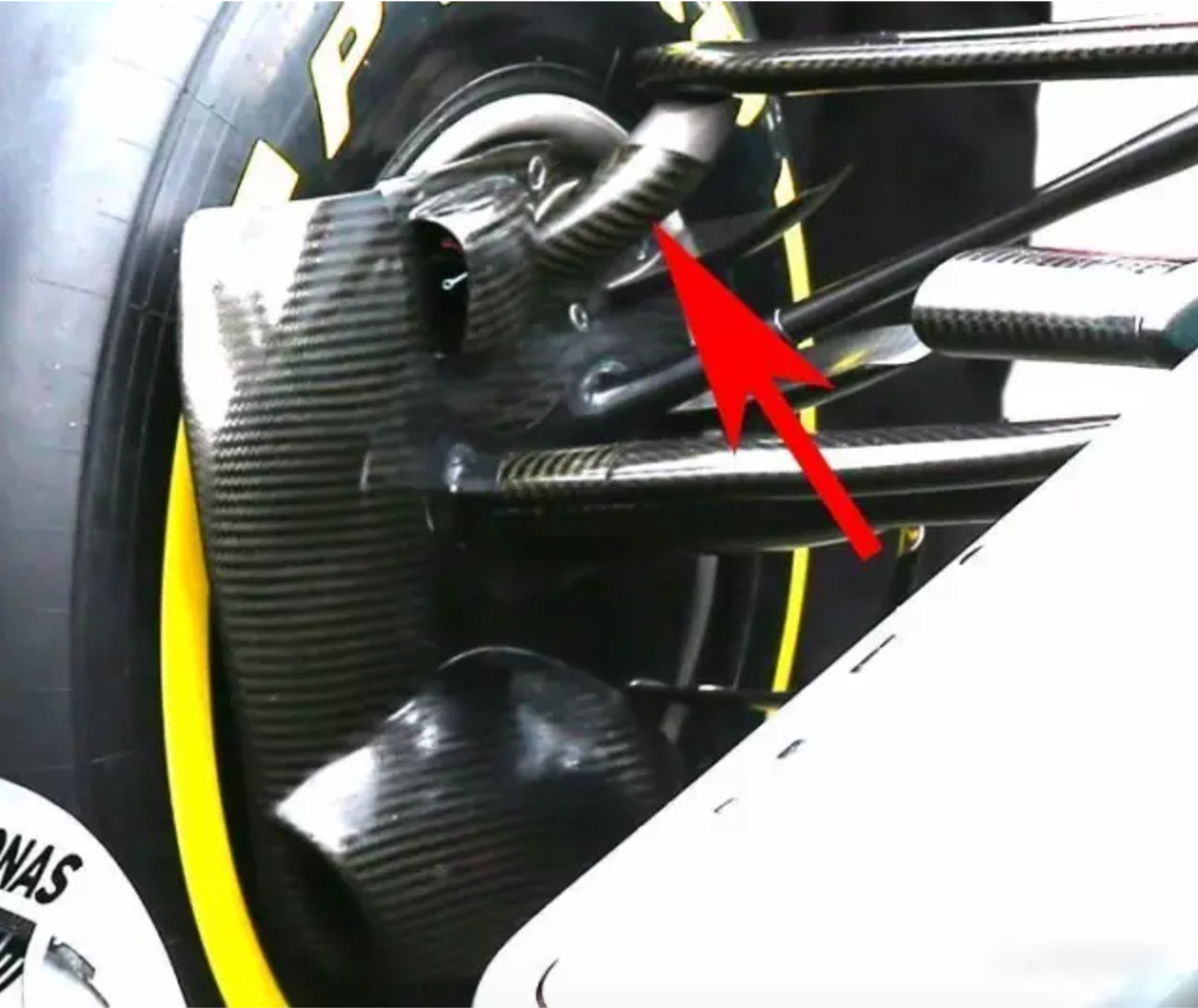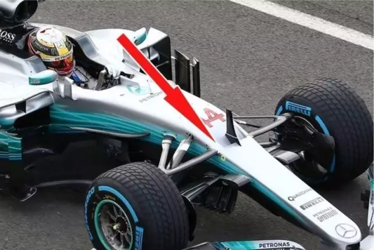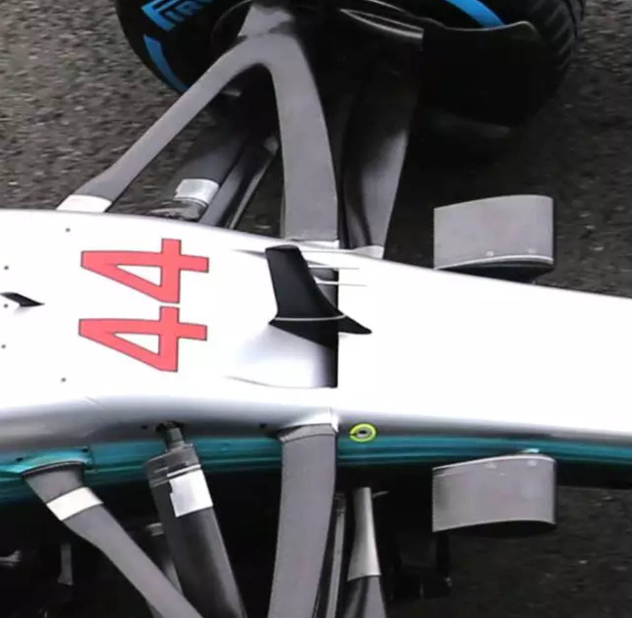 W08的引擎罩上还设计了一个很小的冷却出口,而在尾翼中央立柱的前方,还有一个加装其他部件的位置。在梅赛德斯银石首航的下午,这个位置上出现了一个奇怪的部件,一开始猜测是传感器,但是后来认为它其实是空气动力学套件的一部分。这个小翅膀的高度和宽度可能接近于2016年的尾翼规格。