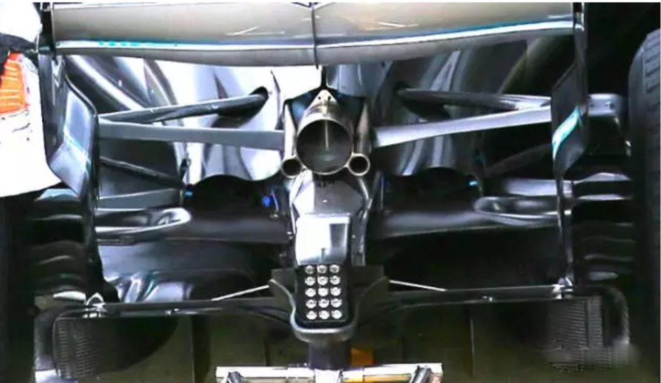 梅赛德斯W08的赛车后部也是下足了功夫,依旧是拉杆后悬挂,但是整体可乐瓶区域以及车尾有更紧的收缩。