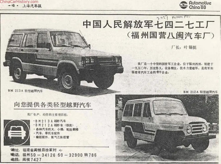 实际上福建的汽车工业起步并不晚,1959年就成立了永安修车厂,1966年福建汽车厂又用212图纸造过福建牌66A型越野车,后来还造过不少卡车和农用车。