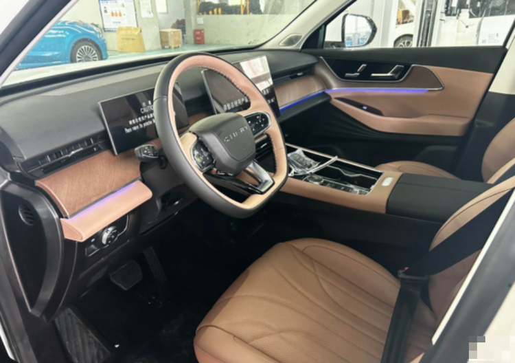 进入车内,瑞虎8L的内饰设计同样令人惊艳。黑棕双色的配色方案加上木纹饰板点缀和环绕式氛围灯,营造出一种奢华而舒适的氛围。双色多功能方向盘、电子怀挡、手机无线充电等配置一应俱全,大大提升了驾驶的便利性和舒适性。同时,15.6英寸悬浮式中控屏、10.25英寸全液晶仪表盘以及HUD抬头显示等高科技配置的加入,使得瑞虎8L在智能科技方面达到了同级别车型的领先水平。