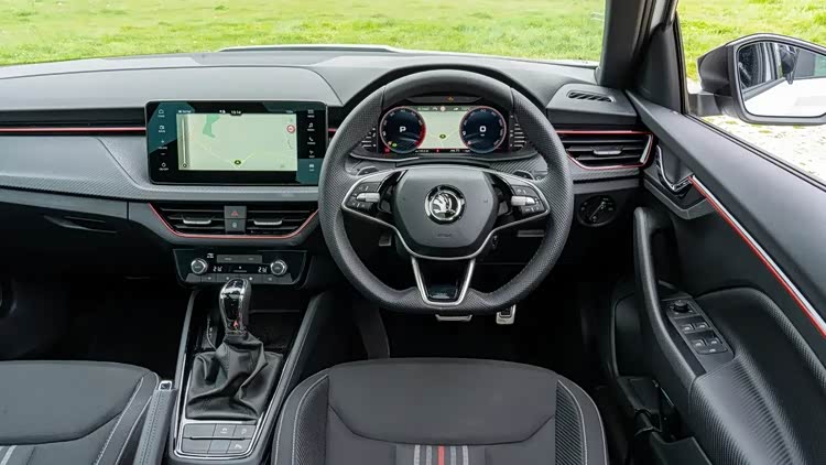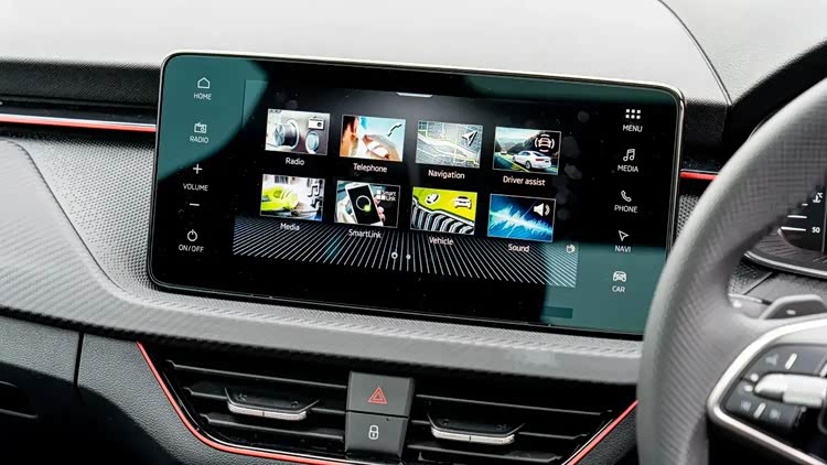 在内饰方面,Kamiq同样展现了斯柯达对于品质和细节的执着追求。新车采用了家族最新的悬浮式大尺寸液晶屏设计理念,虽然屏幕尺寸受限于车型定位,但全液晶仪表盘和双屏系统的组合仍然为车内带来了不错的科技感。新一代设计的方向盘相比国内柯米克更为时尚和动感。中控台面以塑料为主,但加入了特殊质感的花纹覆盖,提升了整体的档次感。Monte Carlo版本更是通过随处可见的红色缝线、打孔方向盘以及座椅等处的白红色装饰条细节,进一步提升了车辆的运动感和身份感。