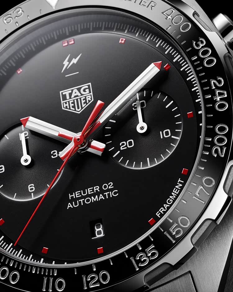 2020年,我接触过一款泰格豪雅和藤原浩联名的一款腕表,全称是“泰格豪雅Fragment Design Heuer 02联名款计时码表”,这款腕表基于品牌经典的F1系列打造,采用了44毫米精钢表壳,黑色陶瓷圈带有刻度,标准的对称“双小盘”设计,六点钟位置有一个日历小窗,12点位置则是藤原浩标志性的“双闪电”。