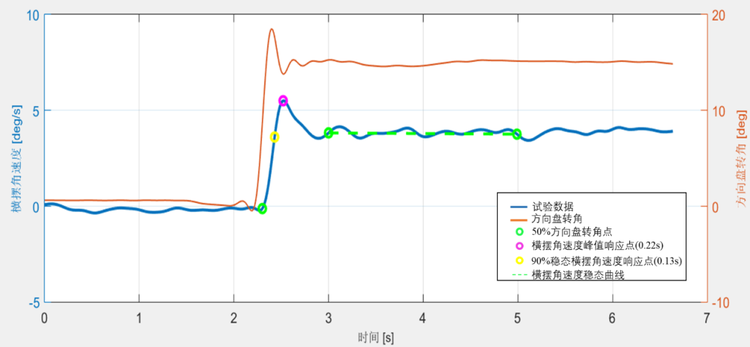 再例如操稳客观测试中的角阶跃试验,它要求车辆以100km/h速度保持直线行驶2s以上,固定油门,然后快速转动方向盘到车辆进入稳态时能维持在0.2g、0.4g、0.6g侧向加速度所对应的转角,用以测量车辆的侧倾、横摆响应情况。