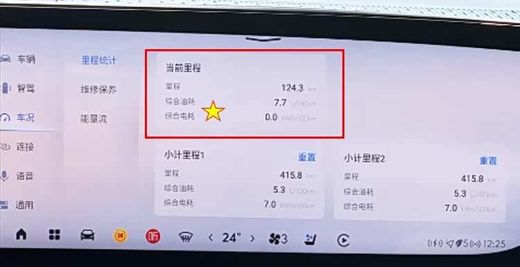 高速时,发动机直驱的油耗也很惊艳。图片中红框内,当前里程124km,电耗为0,说明纯油驱动,高速,百公里仅为7.7个油,还有谁能做到。