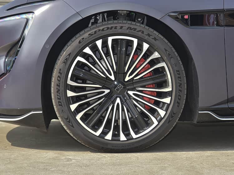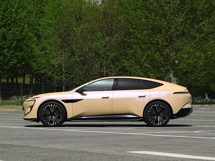 侧面的车身姿态低趴,整车采用短后悬的设计,较高的车头占比看上去有种轿跑既视感,双腰线贯穿门把手,拉伸整车视觉长度,车窗也进行扁平化处理,配合隐藏式门把手,能够降低行驶过程中的风阻系数。后视镜下方以及侧裙处还配备高亮的饰板点缀,密幅式轮毂提供20/201英寸可选,内部配备运动卡钳。