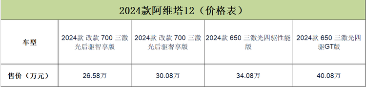 从价格来看,2024款阿维塔12共有4款车型可选,指导价为26.58-40.08万元,和同级别车型相比较,价格给出诚意。