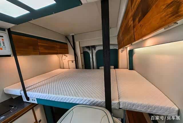 会客区上方设置了一张电动吊床,是车内的休息区,床的尺寸为1800x1200mm,可满足多人睡眠休息;夜间睡眠时降下床铺,不使用时可升起吊床,增加车内使用空间。
