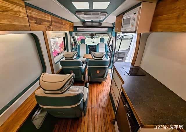 后方生活区采用“沙发卡座+电动吊床”布局,满足日常乘坐休息、聊天等需求;地面铺设游艇级进口柚木实木地板,耐磨耐污,脚感舒适;照明系统配备LED暖光照明灯,营造出温馨的旅居氛围;空调供暖系统配备了4000W/5000W埃贝赫驻车水暖加热器、48V冷暖变频空调、1800W INNOVATIVE电加热器,保证车内温度适宜;生活区还配备了29寸LG电视机、JBL蓝牙音响、小米影音网络系统等娱乐设施,丰富户外旅行的娱乐方式。
