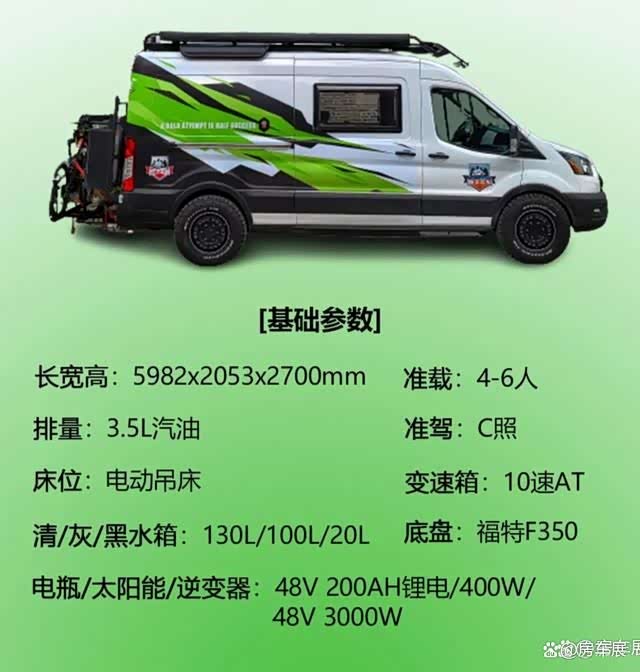 整车基于美国原装进口福特F350四驱底盘打造,动力方面搭载3.5L V6汽油发动机,最大功率231kw,峰值扭矩536N·m,动力性能优越;传动系统匹配10AT变速箱,换挡平顺,驾驶舒适;4x4全时四驱系统让这款车在野外也畅行无阻;续航方面配备95L油箱,带有油箱盖加锁、NOx检测仪,为旅行安全保驾护航;轮胎采用235/65R 16C规格,耐磨耐撞,能够提供良好的抓地力。