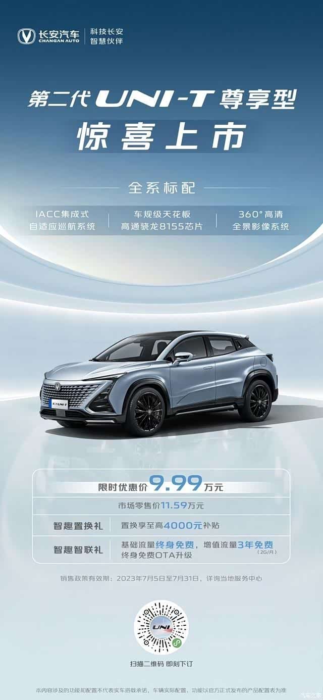 车家号·0浏览·2024-07-04 07:40 · 陕西近日,长安汽车宣布,UNI-T尊享型正式上市,售价11.59万元。在7月5日-7月31日,限时优惠售价9.99万元。购车还能享受置换礼、智联礼等。新车配备自适应巡航、高通骁龙8155芯片、360°全景影像等配置,性价比不错。