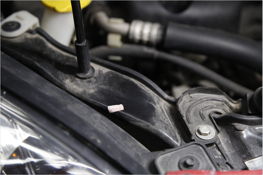 这台车的引擎盖也拆装过,并且水箱框架也更换过,这个框架上的标签是原厂车绝对不会有的,这事故小不了,让我开着台车去郊游,我想我是拒绝的......不过这车的大梁什么的还是比较完整,所以不算是大事故车,只能算是有过碰撞的车,还好不是大事故,不然想到那小作坊的手艺,背后都阵阵发凉。