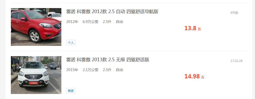 在二手车市场里科雷傲和奇骏价格差不了多少,12年的车大概在14-15万左右,再加上科雷傲车源要比奇骏少得多,所以实际上价格并不是太好谈的下来,如果运气好,13万左右也能拿下来。