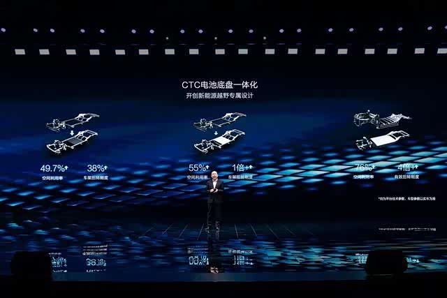 具体来看,通过将越野专属双层刀片电池和高强度钢占比96%的大车架结合,演化出的CTC电池底盘一体化技术,实现大车架扭转刚度较传统豪华越野车提升38%,正碰侵入量降低30%,侧柱碰侵入量降低25%,整车质心也更趋向于黄金中点,并实现50:50的黄金轴荷比,且底盘空间利用率提升49.7%。
