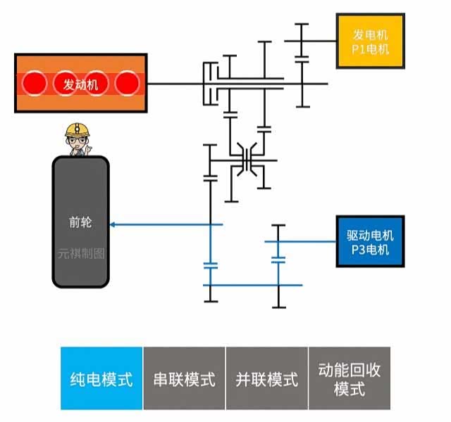 显而易见的解决办法就是增加离合器的挡位,将一档变为二档,或者改变后段的传动耦合原理。正规标准称呼为“双电机同桥耦合DHT混动系统”。具体如下: