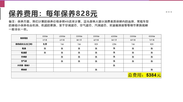 保养层面,新车首保为5000公里或6个月进行,首保免费,之后基本每10000公里或12个月保养一次,6万5千公里/6年半计算总的保养支出为5384元,如果按照6年半来计算,平均一年保养费用为828元。