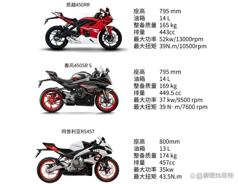 阿普利亚RS457:座高略高,为800mm,油箱容量为13L。虽然整备质量达到174kg,但其457cc的排量、最大功率35kw和最大扭矩43.5N.m,使得这款车在赛道上表现出色,适合追求刺激的新手骑士。