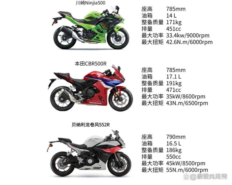贝纳利龙卷风552R:座高790mm,油箱容量达到了16.5L,整备质量为186kg。其550cc的大排量、最大功率45kW/8500rpm和最大扭矩55N.m/6000rpm,使得这款车在动力上更为强劲,适合追求高性能的新手骑士。