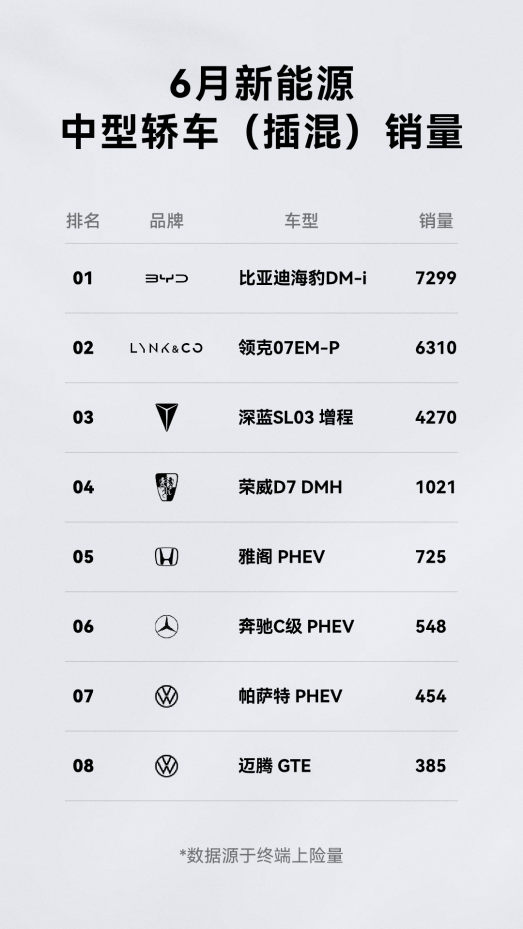 领克07 EM-P在安全测试中脱颖而出,也在销量上有所体现。6月新能源中型轿车(插混)销量榜单中,领克07 EM-P以6310辆的销量成为第二名,让更多用户切实领略到来自领克07 EM-P的细节安全魅力。