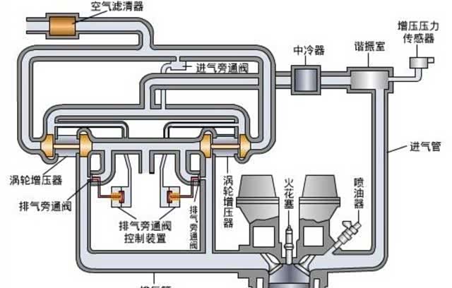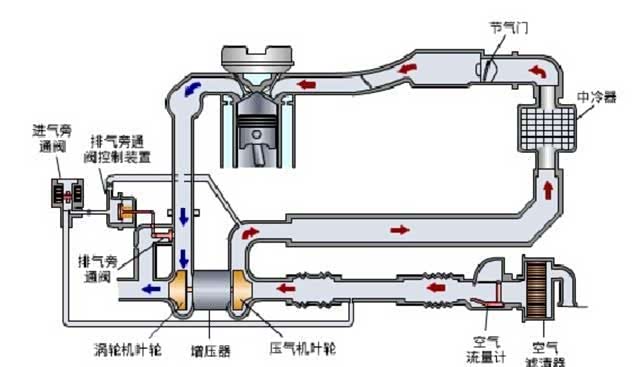 通俗的说,涡轮增压发动机就是在自然吸气发动机的基础上增加了一个鼓风机(涡轮增压器),这个鼓风机的动力来自发动机的尾气推动涡轮高速转动,通过同轴带动叶轮高速转动,产生压力,增加进气压力,达到增加输出功率的目的。如下图,通常,涡轮增压发动机还需要匹配中冷器(降低进气温度)、进气旁通阀(控制增压器是否作用)、排气旁通阀(限制最大压力)等。