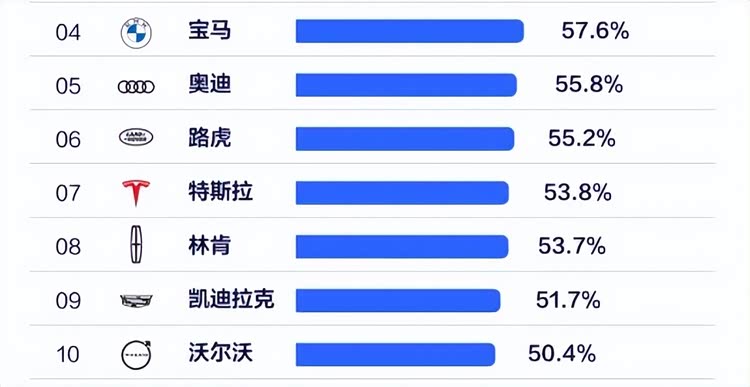 其中,宝马以差不多2%的优势领先于奥迪和路虎,而后两者之间则是仅存在微弱差距,奥迪以55.8%略微领先于路虎的55.2%。