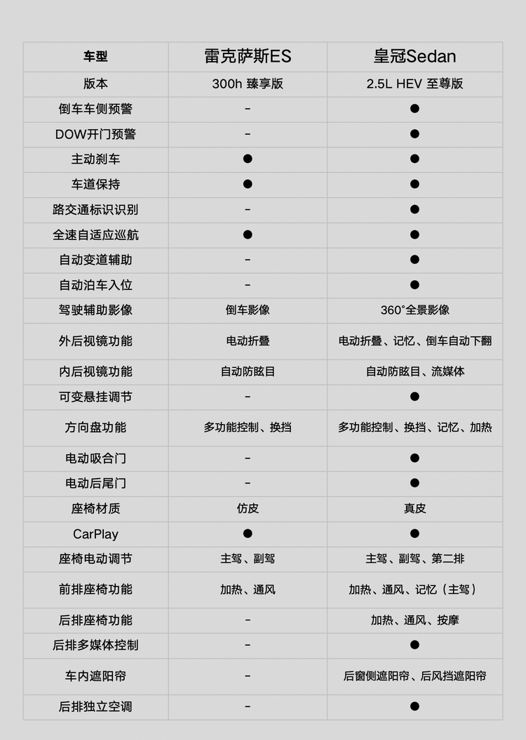 从对比中可以发现,雷克萨斯ES 300h 臻享版的产品表现很均衡,只要你不在意它凯美瑞换壳的身份,那它可以说是哪哪都是优点,品牌硬、颜值高、空间实用而且还省油,是一个不会出错的选择。而皇冠Sedan 2.5L HEV 至尊版则是长板和短板都比较明显的产品,雷克萨斯LS同源底盘结构、前置后驱动力布局、大气的外形、丰富的配置都是亮点,不过在空间和经济性方面不够出色,是一个更加“任性”的选择。