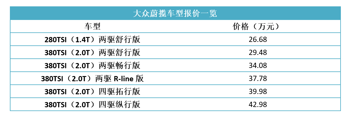 其他车款搭载的则都是大众2.0T的EA888发动机,最大马力220Ps,最大功率162kW,最大扭矩350N·m。变速器则搭配了7速或6速双离合变速器。总的来说,蔚揽的动力系统都是大家熟悉的大众味道,入门级动力稍显不足。