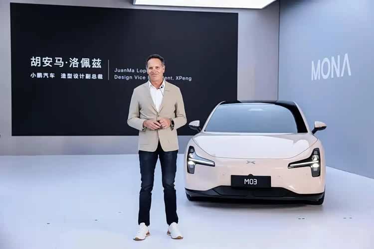 胡安马·洛佩兹站在小鹏 MONA M03 车前