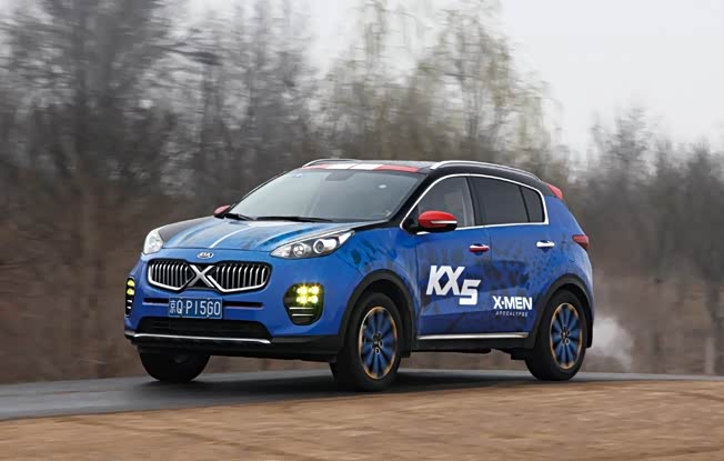 需要特别说明的是,拍摄使用是KX5特别试驾版车型,全车贴有车贴,改装了前进气格栅,内饰与普通版本车型保持一致。普通版本的KX5最为抢眼的设计元素是家族式虎啸前进气格栅,但中间的网纹变成了点状。大灯位置也高于前发动机舱盖的位置,给人感觉犹如怒目圆睁一般。单看灯组的设计,三款车中,KX5是最具特色的。比如配置远近光一体式的HID氙气大灯,同时日间行车灯和前雾灯使用了LED灯泡。前后翼子板采用外扩式设计,让车身显得更加宽敞。