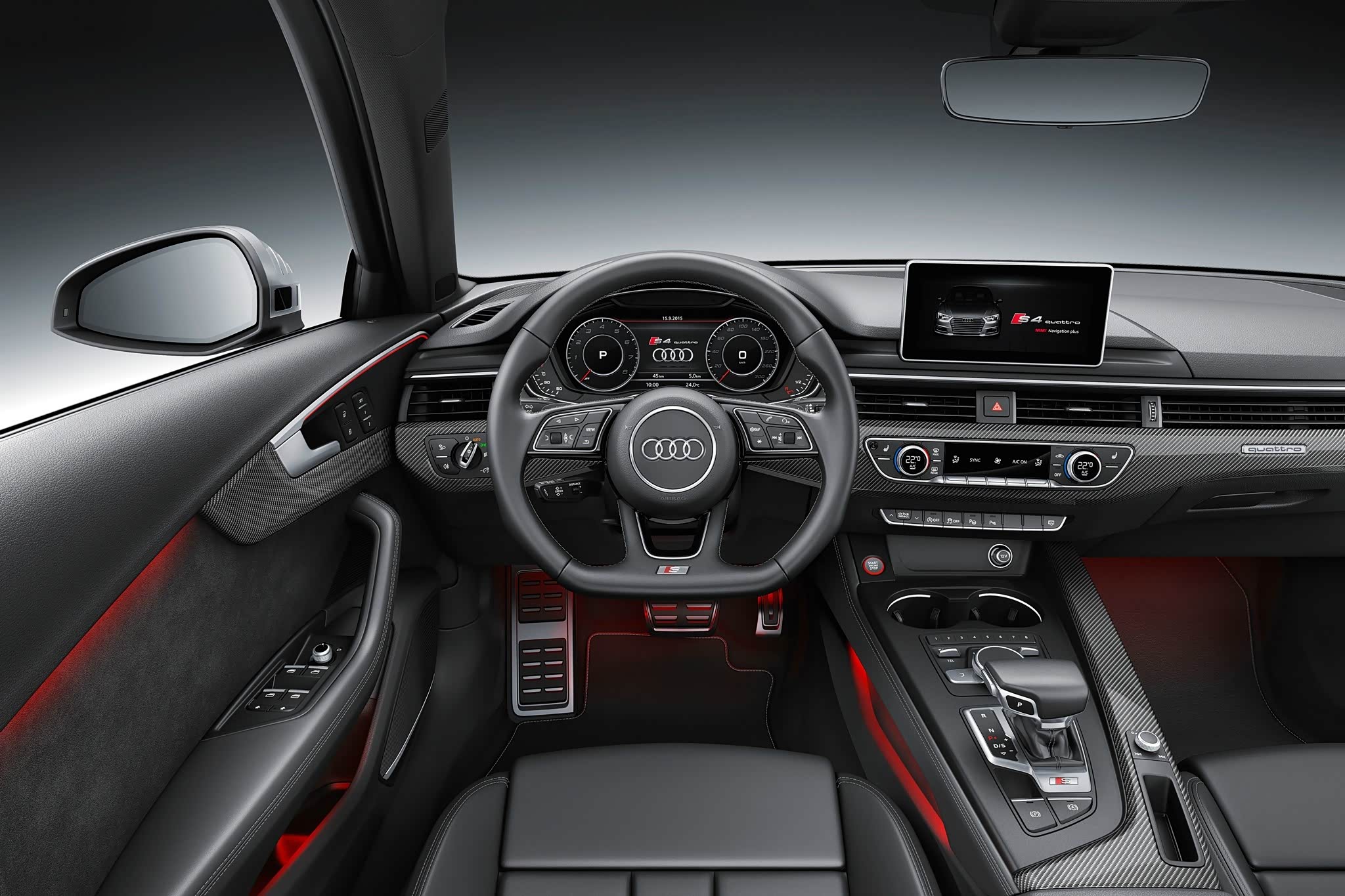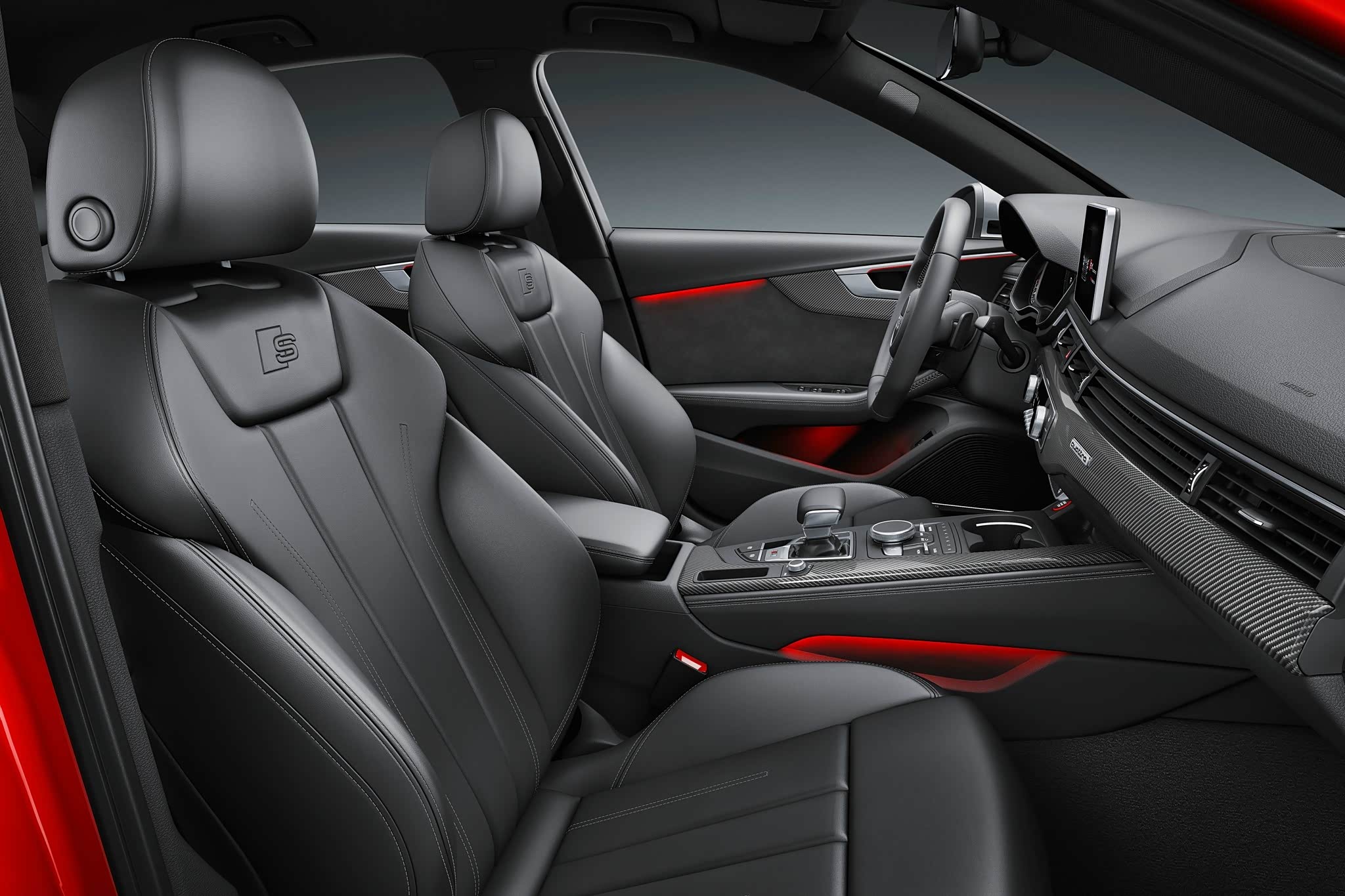 内饰的变化更大,S运动型平底方向盘、S运动型座椅,S标志的挡把,以及碳纤维材质的使用,可以瞬间提升内饰运动气质,加上转速中置且带有S4 logo的液晶仪表,让车主驾驶欲望满满。