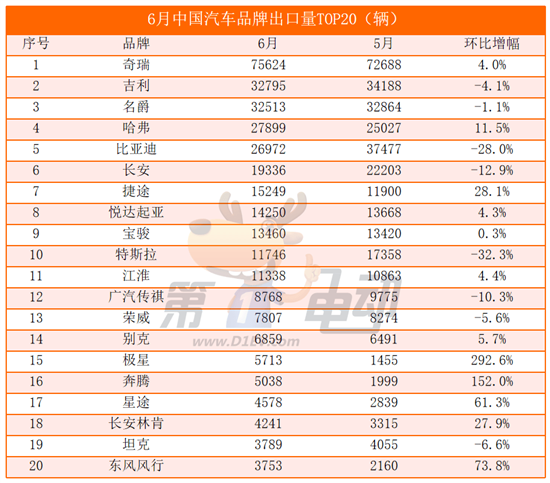 吉利汽车在6月份的出口量达到3.2万辆,超过了比亚迪和名爵,首次夺得亚军的位置。吉利旗下共有10款出口车型,其中主力车型缤越的出口量环比大幅下降34%,但帝豪、星越L、星瑞等车型的出口量有所上涨。