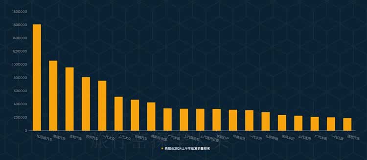 笔者梳理总结出来销量前20榜单发现,2024年上半年,20家车企中有16家销量实现同比增长,占比达80%。其中,比亚迪上半年销量达到161.3万辆,位列第一;销量增幅最大的为吉利银河品牌,上半年销量同比增长742%。