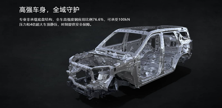 更值得关注的是,坦克400 Hi4-T的车身采用了高达76.6%的高强度钢材打造,能够承受超过100KN的压力。其车身抗扭转刚度达到了30067Nm/°,抗弯曲刚度则达到了惊人的6322N/mm,能够在紧要关头为驾乘人员提供“硬核”保护。