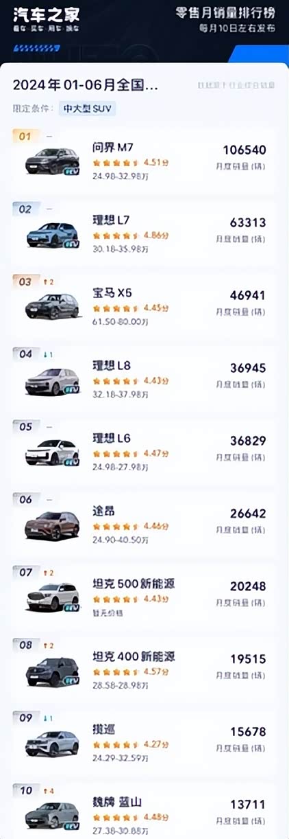 与此同时,根据汽车之家2024年上半年销量排行榜数据,问界新M7上半年累计销量106540辆,断崖式领先第二名,稳坐中大型SUV销冠,持续领跑中国新势力市场。