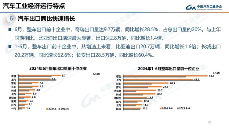 长安汽车在上半年的出口量也表现出色,以28.5万辆的成绩位列第三,同比2023年增长了60.4%。吉利汽车紧随其后,上半年完成24.2万辆的出口。吉利集团在7月初上调了年销量目标,这无疑反映了其对出口市场的信心。