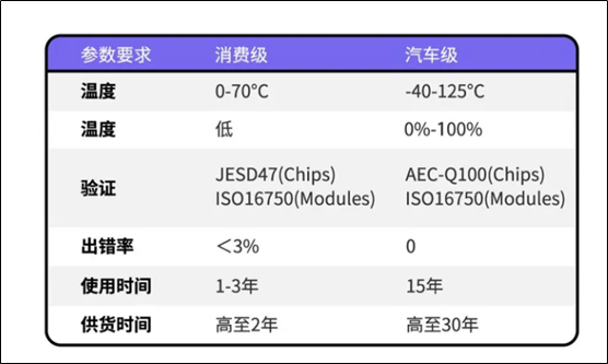 和手机、电脑等消费类产品相比,汽车的工作环境更为复杂,需要应对各种极端环境。比如,手机芯片仅需满足0°C-70°C的工作环境,而车规级芯片要承受的温度范围一般在-40℃至+125℃之间。除了温度以外,还需要考虑湿度、粉尘、震动等因素对芯片的影响。因此,这对芯片制造提出了很高的要求。
