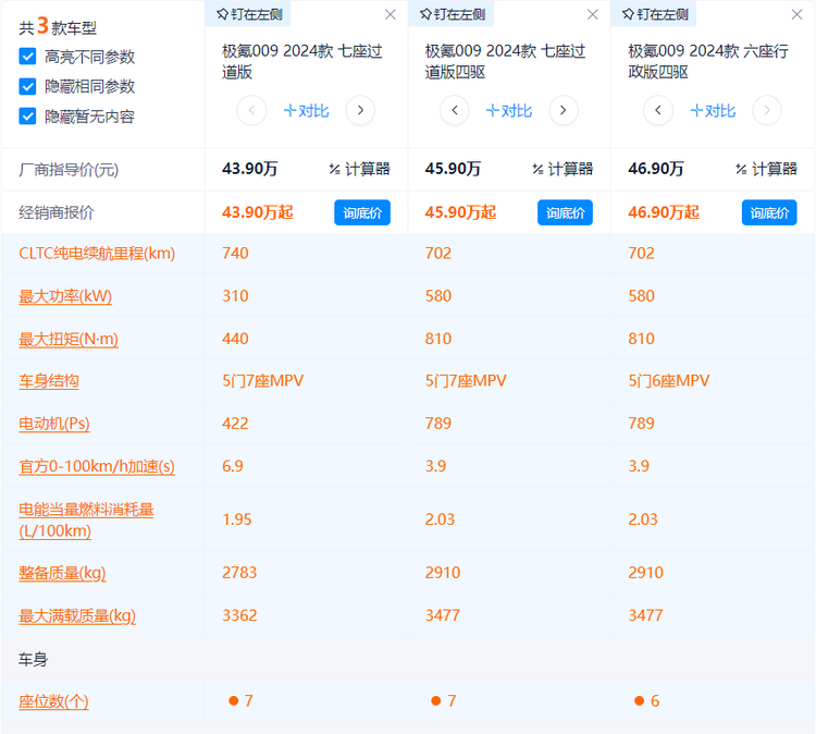 价格来看,极氪009的售价分别为43.9万、45.9万以及46.9万元。