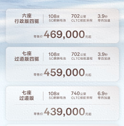 其实仔细看这三款车,不同的侧重点非常明显。比如售价在43.9万元的标配其实是续航最长的版本:749公里。这款车的定位非常明确,就是追求普通MPV的家庭消费者,续航够用,价格也有优势;售价照5.9万和46.9万元的两款车型,都搭载的是双电机,续航都是702公里,但中配车型是7座四驱版,46.9万元车型是6座行政版,分别适合需要动力与性能的消费者以及商务需求的消费者。